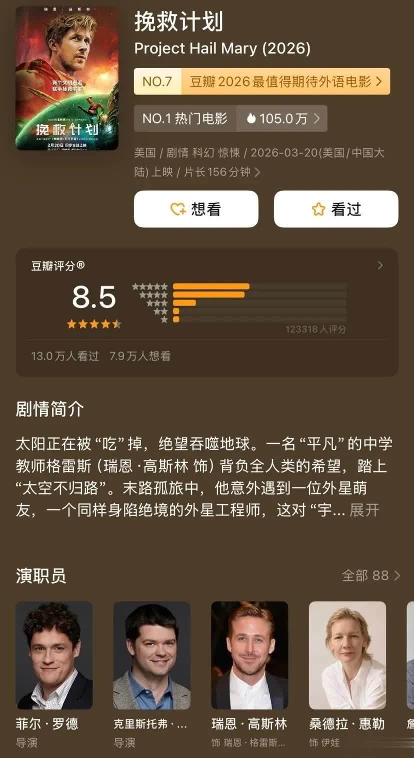 男主角瑞恩·格雷斯(Ryland Grace)的上演者为瑞恩·高斯林(Ryan Gosling),也被人人称作“高司令”。他在本片中是实足的中枢东谈主物,戏份占比亦然最大的,约略在80%傍边,单东谈主扛片才调绝顶强,演技也过硬。