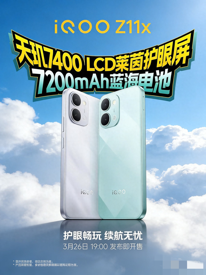 看成iQOO Z系列2026年的首款续航力作,Z11x刚一曝光就凭借"7200mAh超大电板"的中枢卖点赚足眼球。3月24日,官贞洁式官宣该机定档3月26日CrownSports19:00发布,发布即开售,同期公布冰青绿、雪屿白、夜影黑三款全新配色,用硬核续航与高颜值想象,精确击中千元档用户的中枢需求。