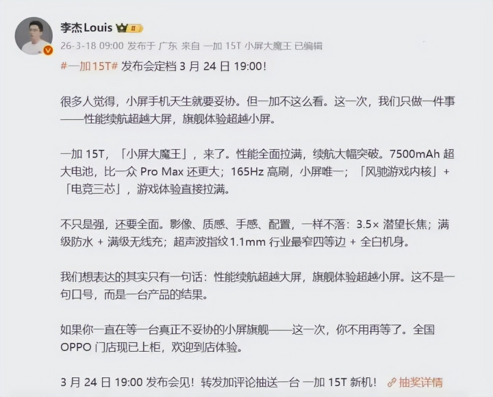 一加官方一记重锤砸下来,一加15T,3月24日19:00厚爱发布!