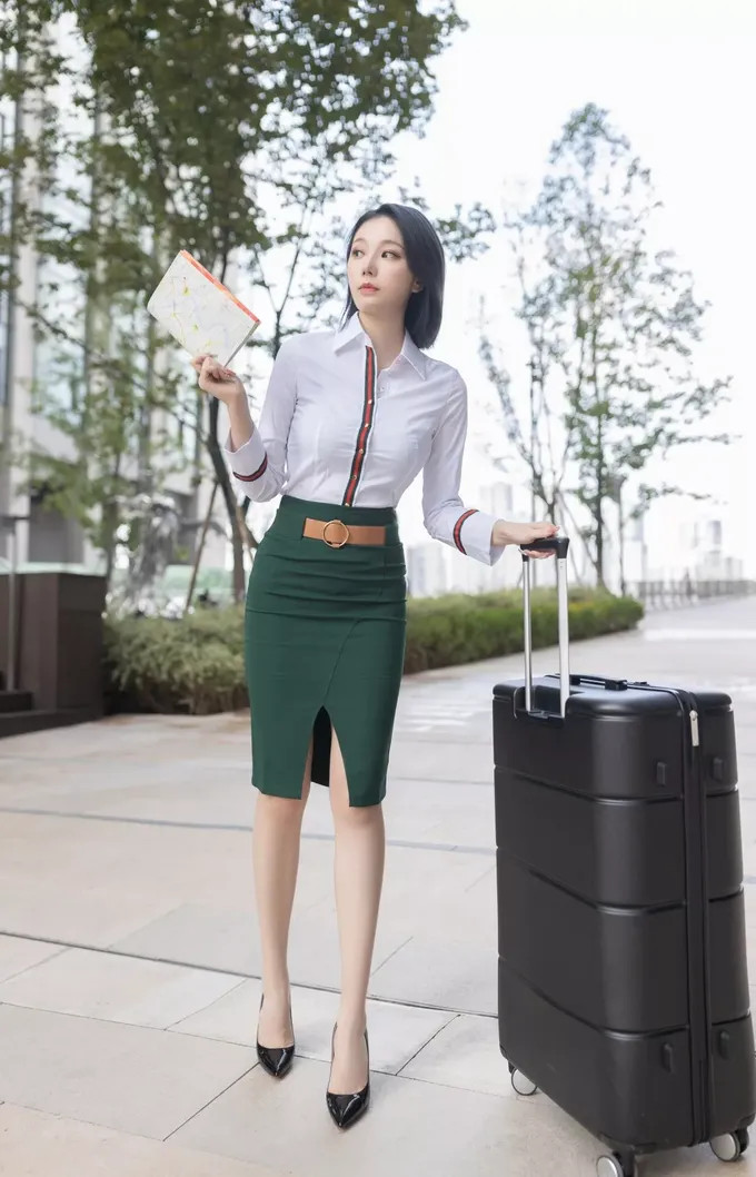 关于时常穿梭于不同城市、以至不同期区的职场女性而言,商务出行不仅是一场体能与脑力的双重磨练,更是一次个东谈主管事形象的流动展示。如安在舟车接力中保捏多礼,在商务洽商中展现专科,同期又不失女性零星的优雅与精致?这套以白衬衫搭配乌绿色包臀裙的穿搭,给出了一个号称教科书级别的范本。