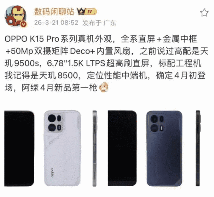 距离官合模范发布还有十多天,3月下旬就有网友在微博上提前曝光了OPPO K15 Pro的真机图片,在本年的中端手机商场里,这台新机的价值不仅仅更换了中枢芯片,更体现出OPPO想要进一步提高K系列性能机定位的决心,直屏瞎想、金属中框以及主动电扇等建立一起搭载,高配版块以致有望摄取天玑9系处理器,比较外不雅而言更能勾升引户期待。