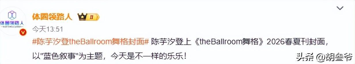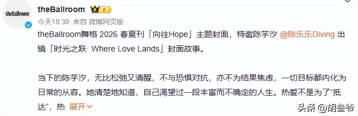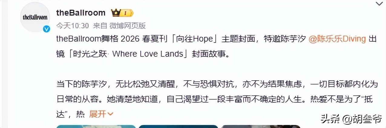 陈芋汐负责官宣登上《theBallroom 舞格》2026春夏刊封面,主题定为向往Hope,封面故事叫时光之跃Where Love Lands。